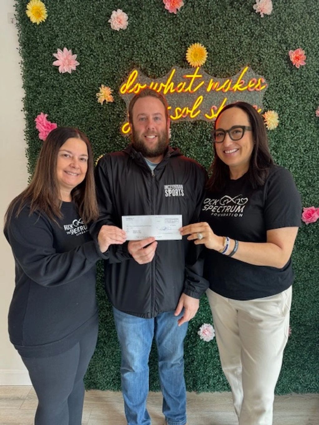 CO-FOUNDERS KATIE & CANDACE PRESENTING A CHECK FOR $9,450 TO GREG PERKINS OF INCLYOUSION SPORTS. THE MONEY WAS RAISED DURING OUR FUND-A-NEED LIVE AUCTION AT OUR 2023 GALA, AND WILL GO TOWARDS THEIR PLAY IT FORWARD SCHOLARSHIP WHICH WILL GIVE CHILDREN OF ALL ABILITIES THE OPPORTUNITY TO PARTICIPATE IN THIS INCREDIBLE SPORTS SKILLS PROGRAM.
